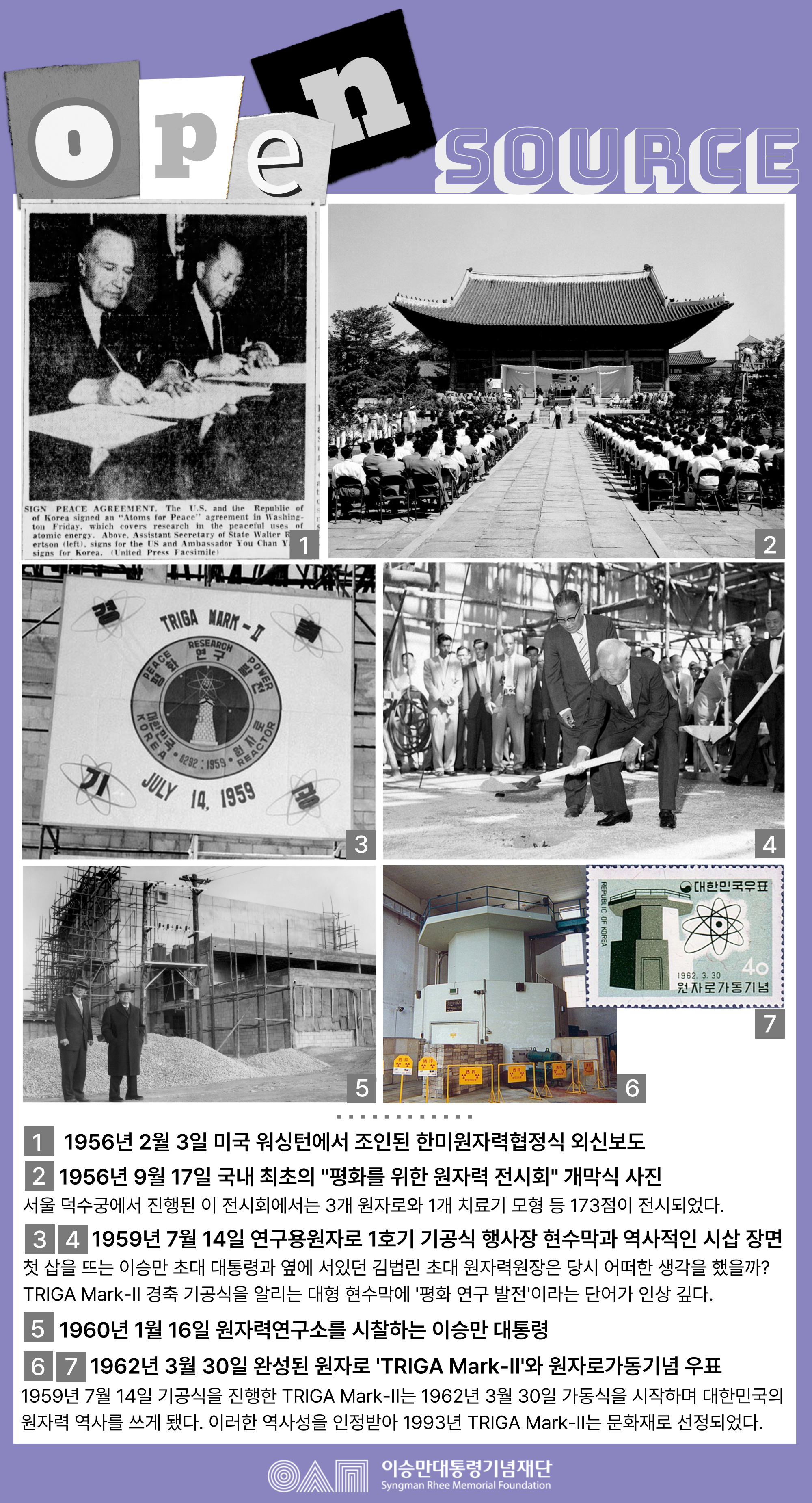 1956년 9월 17일 원자력 전시회 개회식 기념사에서 이승만 대통령은 “평화를 위한 원자력은 자유를 의미합니다. 원자력은 한국을 강력하고 훌륭한 민주국가로 만드는 데 도움을 줌으로써 통일을 촉진시킬 수 있을 것입니다.”라고 말했습니다. 그는 원자력의 힘을 단순한 기술이 아닌 국가의 자립과 자주적 성장의 원동력으로 인식하고, 자원이 부족한 나라에서 ‘지식과 기술’이라는 새로운 자원을 만들어낸 것입니다.