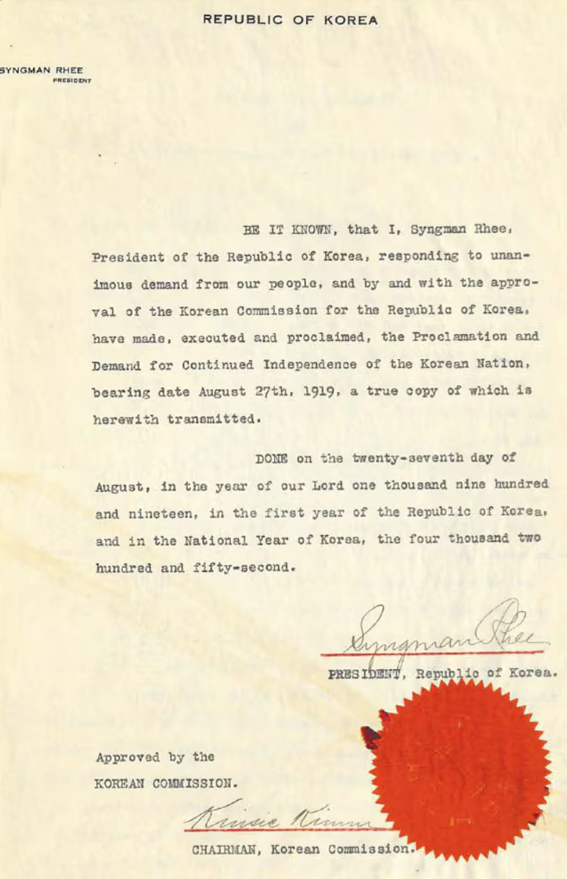 ◇독립 외교의 시작, 구미위원부 이 단계에서 이승만은 민족의 대표성을 띤 공식 외교기관의 출범이 시급하다고 판단했다. 그래서 미국의 수도 워싱턴DC에 독립 외교 전담 기관으로 구미위원부(Korean Commission)를 창설했다. 이것은 주권을 상실한 민족이 독립을 목표로 대사관이나 공사관 대신 한시적으로 운영했던 특수한 형태의 외교기관이었다고 볼 수 있다. 이해 8월 25일 설립을 공포한 구미위원부는 27일 ‘독립 선언 및 독립 요구문’의 발표와 함께 공식 출범식을 가졌다. 한국 독립 외교의 시작을 알린 이날 출범식에 관련된 자료가 최근 발견됐다. 한국학중앙연구원의 ‘미공개 이승만 자료 정리 사업’을 통해서다. 이승만이 소장하고 있던 이 문서는 출범식의 내용, 독립 선언 및 요구문의 원본, 그것에 대한 공표문으로 이뤄져 있다. 독립 선언 및 요구문의 사본은 2007년 공개된 바 있지만 이승만의 친필 서명과 대한공화국 인장이 부착된 원본은 처음 나온 것이며, 출범식의 내용과 순서 역시 지금까지 알려지지 않은 것이다. 이날의 개회사는 대한공화국 집정관 총재 이승만이 맡았고, 구미위원부 직원 임병직이 사회를 맡았다. 출범 기념 기도는 구미위원부 초대 위원인 목사 이대위가 맡았다. 출범식의 하이라이트는 독립을 위한 외교문서 서명식이었는데 ‘한국 민족의 지속적인 독립 선언 및 독립 요구문’을 구미위원부 초대 위원장 김규식이 낭독했다. 이승만과 김규식은 미국 국무부와 상하원 외교위원회에 보낼 영어 사본, 클레망소 파리평화회의 의장에게 보낼 프랑스어 사본, AP 등 언론사에 보낼 사본에 모두 서명했다.