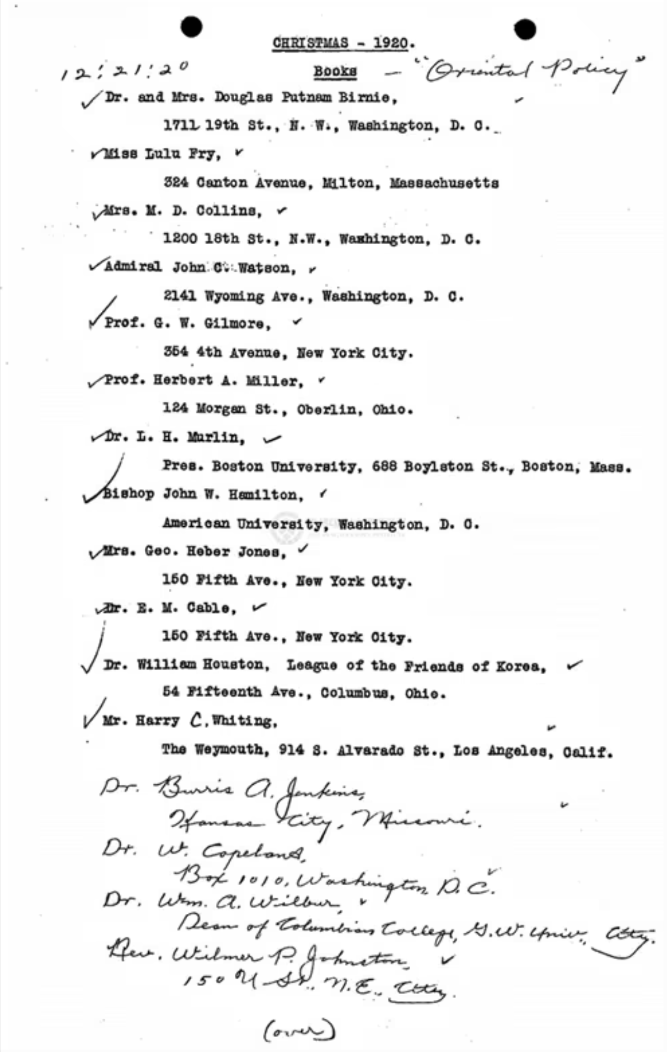 미국에 한국의 실상 알렸다… 親韓 인사들에 독립 관련 서적 배포 ‘톰킨스(Tomkins) 목사, 밀러(Miller) 교수, 콜린스(Collins) 여사, 길모어(Gilmore) 교수….’ 미국인들의 이름이 타자기 글씨와 육필로 적힌 명단이 있다. 최근 한국학중앙연구원의 ‘미공개 이승만 문서 정리·분류 및 DB(데이터베이스)화 사업’을 통해 새롭게 발견된 연세대 이승만연구원 소장 문서다. 1920년 성탄절을 맞아 미국 워싱턴 DC의 구미위원부(Korean Commission)가 한국 독립운동 관련 도서를 발송할 미국인의 이름을 적은 것이다.
